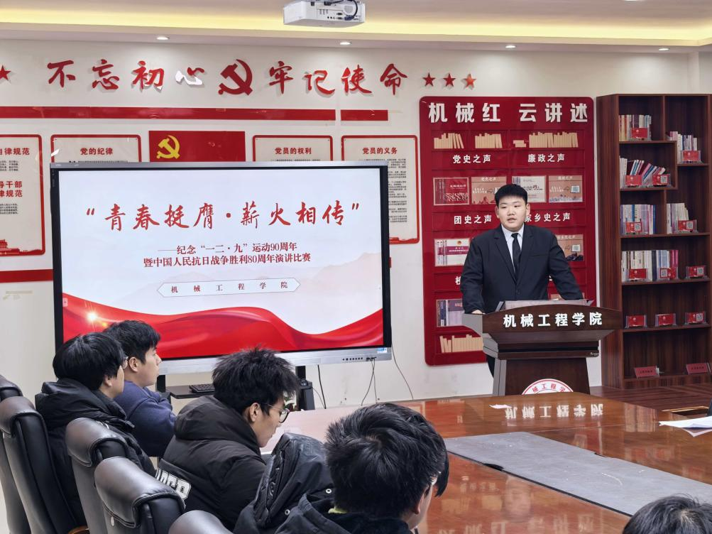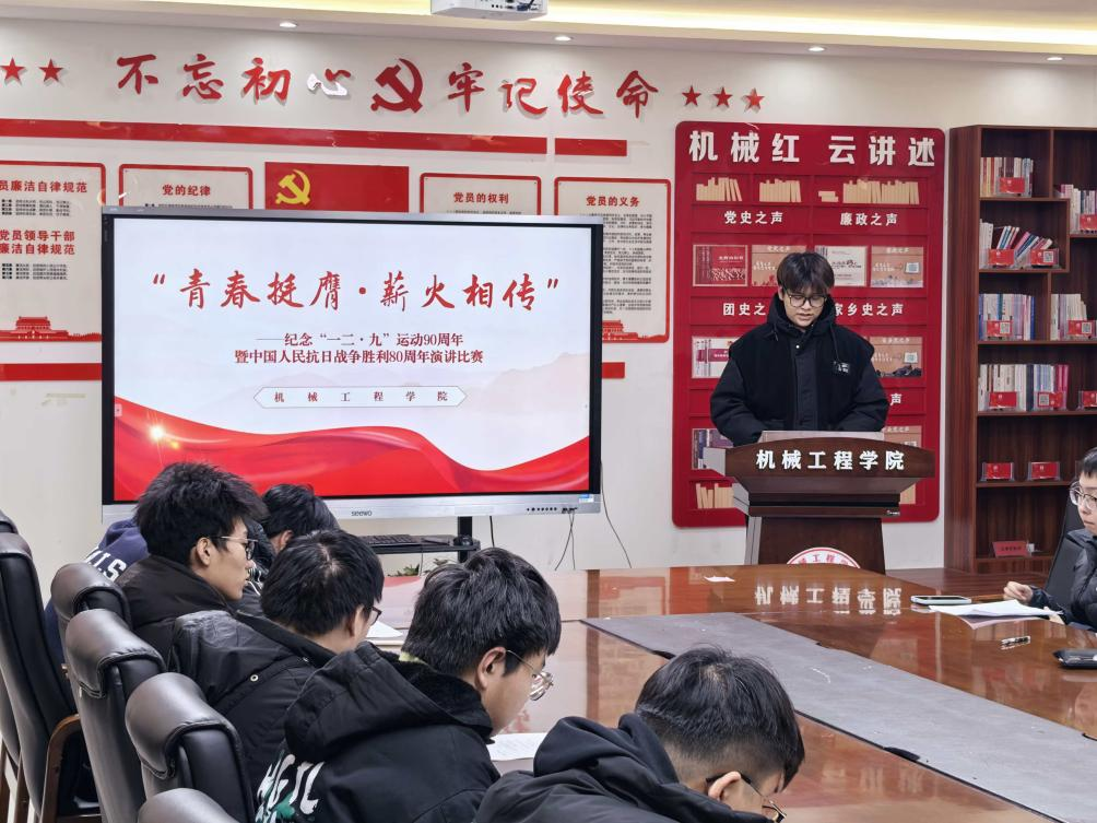 为铭记“一二·九”运动的峥嵘历史,传承红色基因,厚植家国情怀,12月9日晚18:30,在机械工程学院511会议室,我院以“青春挺膺,薪火相传”为主题举办纪念“一二·九”运动90周年演讲比赛,各班团选派的优秀选手同台竞技,以赤诚之声回望革命岁月,用青春担当诠释时代使命。